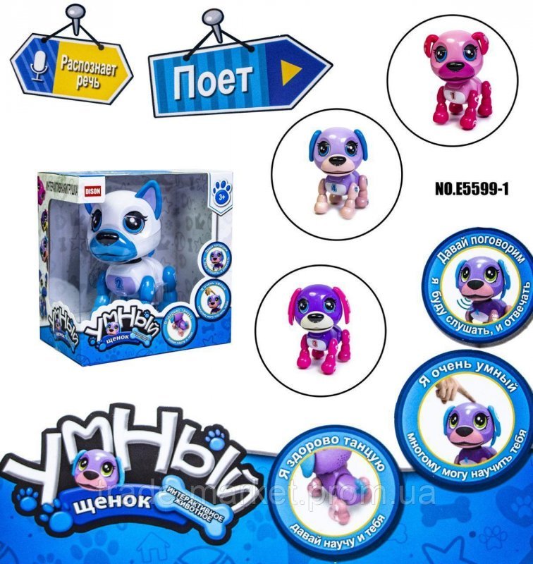 Интерактивная собака "Умный Щенок" E5599-1 . В наличии 4 расцветки: розовый,белый с голубым,лиловый, фиолетовый с малиновым! Игрушка представляет собой собаку с искусственным интеллектом и большим количеством функций, которые позволяют взаимодействовать с роботом, как с настоящей собакой. Робот-щенок с успехом заменит живую собаку, будет любимой игрушкой вашего малыша и подарит ему массу приятных впечатлений. Щенок умеет: 1. Щенок может вилять хвостом, моргать глазками, шевелить ртом и совершать другие движения; 2. Игрушка оснащена сенсором на голове: прикоснитесь к голове щенка и он будет производить различные звуки и действия. 3. Прикоснитесь к голове и подержите некоторое время (примерно 1.5 сек), чтобы войти в режим обучения. В этом режиме скажите несколько слов: щенок запомнит их и повторит. Длительность режима составляет 2 мин. По истечении 2 мин. режим автоматически выключится. Чтобы отключить режим самостоятельно- нажмите на голову питомца. 4. Если щенок остается без внимания в течение 2 мин., он переходит в режим сна и будет ждать следующего отклика хозяина. 5. В интерактивном режиме распознания голоса щенок поет песенки и говорит с хозяином. 6. Питомец распознает некоторые фразы: - Привет. - Будешь моим другом? - Кого ты любишь? - Спой песенку - Давай учить английский - Что ты любишь кушать? - Давай играть - Пока. В комплект входит: - Инструкция на русском языке; - USB кабель. Размер(ГхШхВ) 10 x 16 x 17 см Вес (грамм) 333 Размер упак.(ГхШхВ) 71.00 x 62.00 x 35.00 см