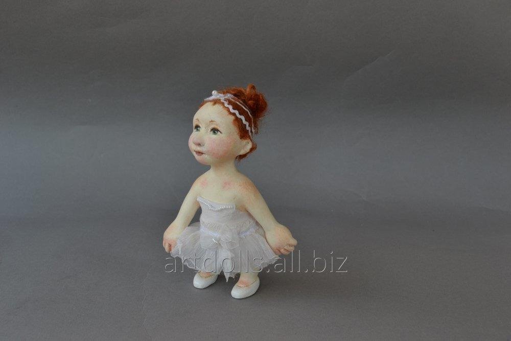 Кукла ручной работы в Украине балерина Соня - миниатюрная рыжеволосая куколка на деревянной подставке в белом шелковом платье с белым бантом, кружевом и бисером.