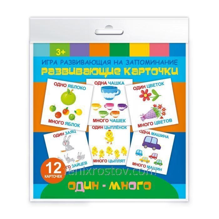 Игры развивающие на запоминание "Развивающие карточки" арт. 52729 ОДИН-МНОГО /110х110мм, 12 картонных карточек 4+0, вкладыш с двумя биговками, мел.бум. 4+0. Инд. упак. - ПЭТ пакет с европодвесом/
