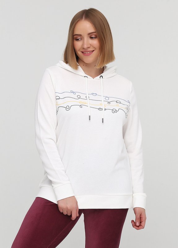 Кофта женская с капюшоном Цвет: белый На передней стороне принт с узором черного, белого и желтого цветов. Состав:коттон80%/, полиэстер20% Стирать с футболками аналогичного цвета при 40°С