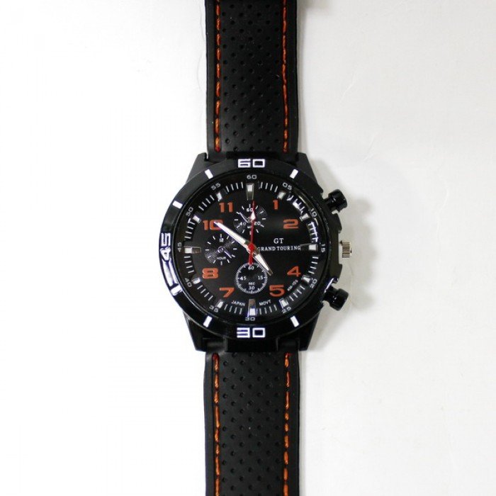 Часы мужские наручные Sanda GT - стильный аксессуар в спортивном стиле. Они сделаны как мужские, но прекрасно смотрятся и на женской руке. Корпус часов металлический, защищенный от царапин. Цифреблат с крупными арабскими цифрами, вокруг размещен дополнительный, с отметками секунд. Для дополнительных измерений на циферблате размещены 3 вспомогательных. Ремешок резиновый, с прошивкой оранжевой нитью по краям и неполной перфорацией. Часы полностью герметичны, можно купаться, принимать душ и быть спокойным за сохранность аппарата. В часах применена кварцевая стабилизация механизма.
