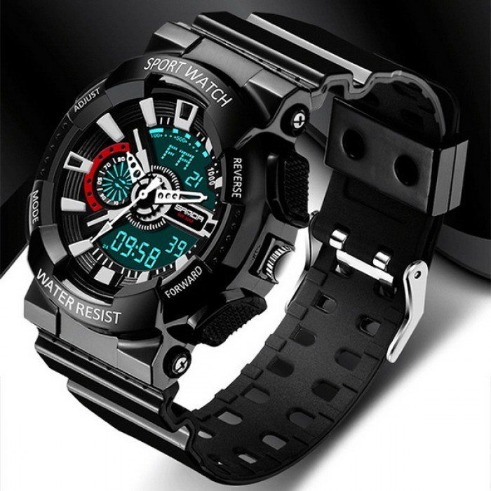 Спортивные часы Powerful Water Resistant 30 m от бренда Sanda - практичная и стильная модель. Корпус массивный, сделан из прочного пластика. Часы имеют два циферблата - электронный и механический. Сверху они прикрыты минеральным стеклом, которое не царапается и практически не бьется. Механизм часов - кварцевый, имеет высокую точность и работает от батарейки. Кроме того, часы имеют дополнительные функции: будильник, секундомер, указатель даты, подсветку. Ремешок часов каучуковый, не натирает и не ломается при ношении. Преимущество часов - водонепроницаемость 30М, то есть в них можно погружаться на глубину до 30 метров. Весят часы 120 грамм. Цвет часов - черный.