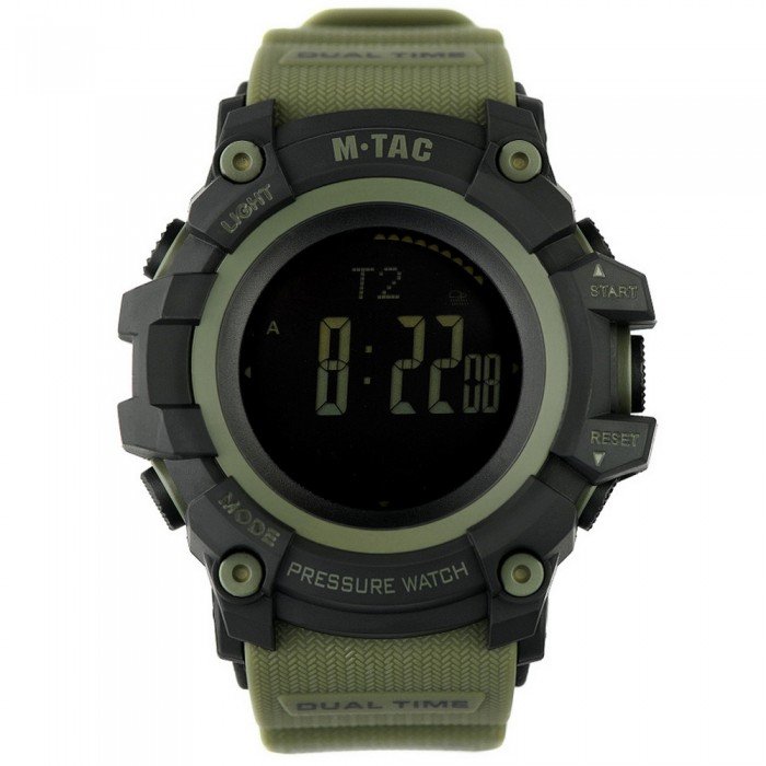 M-Tac часы тактические Adventure черные / олива – идеальный выбор для людей, не представляющих свою жизнь без спорта, экстрима и путешествий. Вместе с этим часы практичны и в повседневном использовании. Электронный механизм помещен в прочный поликарбонатный корпус. Ободок выполнен из нержавеющей стали. Водостойкость модели Adventure от украинского бренда составляет 3 АТМ. Стекло из органического поликарбоната устойчиво к появлению царапин и сколов. Ремешок длиной 22 сантиметра сделан из качественного каучука. Размер корпуса – 4,6 сантиметра (диаметр) и 1,4 сантиметра (толщина). Часы обладают следующими функциями: