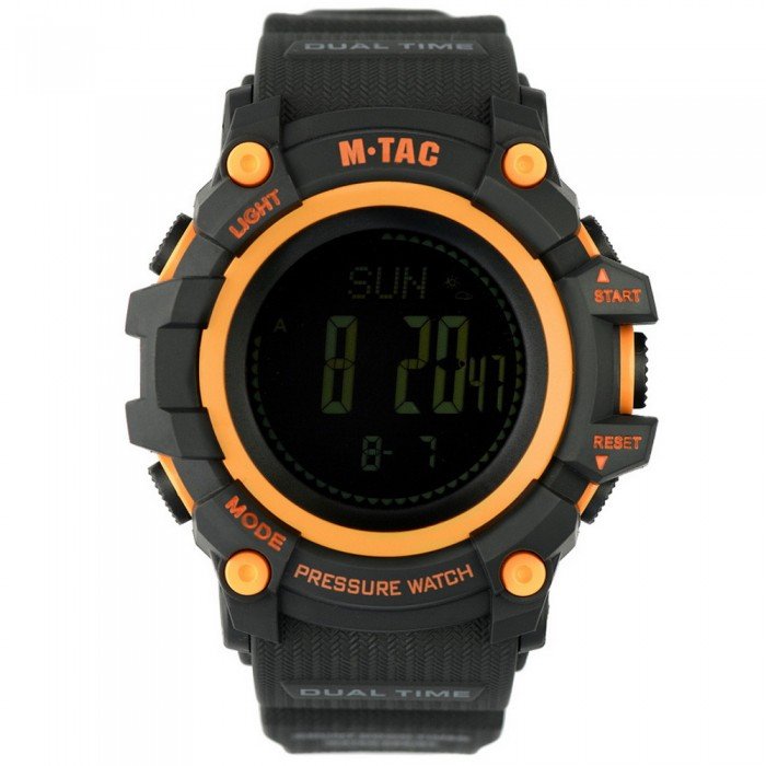 M-Tac часы тактические Adventure черные / оранжевые – идеальный выбор для людей, не представляющих свою жизнь без спорта, экстрима и путешествий. Вместе с этим часы практичны и в повседневном использовании. Электронный механизм помещен в прочный поликарбонатный корпус. Ободок выполнен из нержавеющей стали. Водостойкость модели Adventure от украинского бренда составляет 3 АТМ. Стекло из органического поликарбоната устойчиво к появлению царапин и сколов. Ремешок длиной 22 сантиметра сделан из качественного каучука. Размер корпуса – 4,6 сантиметра (диаметр) и 1,4 сантиметра (толщина). Часы обладают следующими функциями: