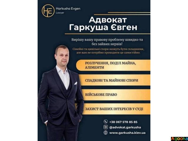 Адвокатські послуги у Києві. Юридична підтримка військовослужбовців. Правова допомога у Києві. Юрист із питань аліментів та розлучень. Кваліфікована юридична консультація в Києві. Адвокат у спадкових справах. Досвідчений адвокат у Києві. Консультація юриста в Києві.Вітаю! Мене звати Євген Гаркуша, і я – адвокат із понад 15-річним досвідом у сфері сімейного, цивільного та військового права.