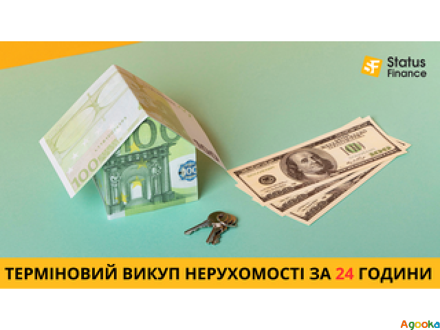 Викуп квартири в Києві терміново. Терміново продати нерухомість у Києві. Викуп проблемної нерухомості в Києві. Викуп комерційної нерухомості в Києві. Терміново продати квартиру в Києві.Фінансова компанія "Status Finance" пропонує послуги термінового викупу нерухомості в Києві та Київській області (до 40 км від столиці). Викуповуємо нерухомість власними коштами. Працюємо з будь-яким типом нерухомості: викуповуємо квартири, будинки, комерційні приміщення. Також можливий викуп проблемної нерухомості (заборгованості з оплати комунальних послуг, арешти та обтяження, потребує ремонту).