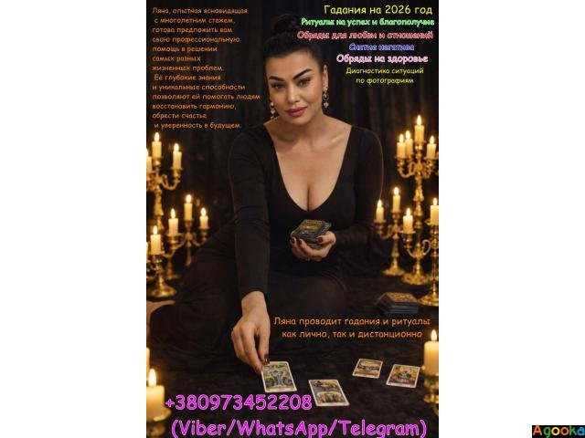 Гадание на будущее. Предсказание на 2026 год. Снятие порчи. Гадание на Рождество. Гадание на Новый год.Столкнулись с трудностями, которые кажутся непреодолимыми? Ляна, опытная ясновидящая с многолетним стажем, готова предложить вам свою профессиональную помощь в решении самых разных жизненных проблем. Её глубокие знания и уникальные способности позволяют ей помогать людям восстановить гармонию, обрести счастье и уверенность в будущем.