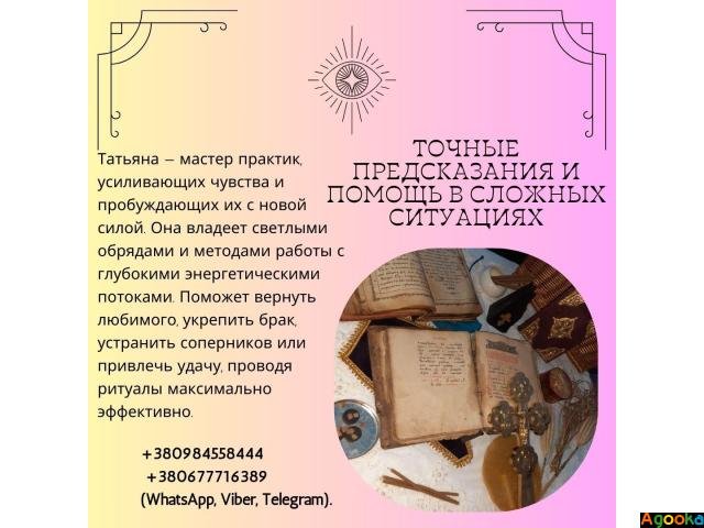 Ищите гадалку, ясновидящую или экстрасенса в Киеве, которая действительно способна помочь в трудных ситуациях? Экстрасенс Татьяна готова провести для вас не только традиционные любовные обряды, но и ритуалы усиленного воздействия, проверенные веками. Ее опыт и глубокие знания в области эзотерики позволяют эффективно решать любые проблемы: от восстановления отношений и привлечения любви до снятия негативных программ и открытия путей к финансовому успеху.Татьяна мастерски работает с практиками, способными усиливать чувства или пробуждать их с новой силой. Она использует как светлые обряды, так и методы, влияющие на энергетические потоки на более глубоком уровне. Если вам нужно вернуть любимого, укрепить брак, устранить соперников или привлечь удачу, она подберет подходящий ритуал и проведет его с максимальной эффективностью.