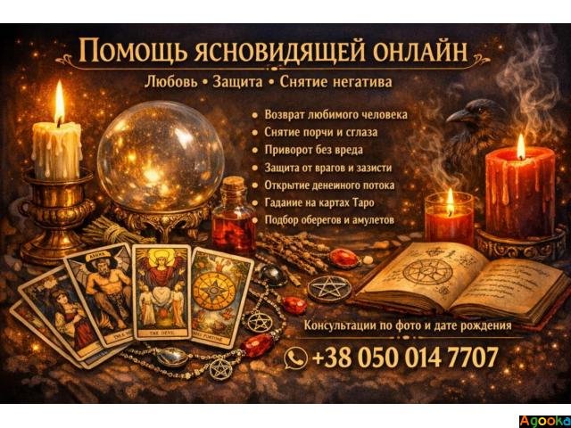 Ясновидящая онлайн, гадание Таро дистанционно, снятие порчи и сглаза, возврат любимого человека, любовная магия без вреда, энергетическая чистка, защита от негатива, открытие денежного канала, помощь ясновидящей по фото, магическая помощь онлайн.В жизни бывают периоды, когда события складываются необъяснимым образом: возникают проблемы в отношениях, появляются финансовые препятствия, пропадает уверенность в себе, ощущается постоянное напряжение и внутреннее беспокойство.