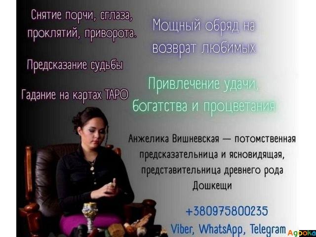 Снять порчу в Киеве. Эзотерик Киев. Помощь мага в Киеве. Гадалка Киев. Таролог Киев. Ясновидящая Киев. Экстрасенс Киев.Анжелика Вишневская — потомственная предсказательница и ясновидящая, представительница древнего рода Дошкещи, обладающая знаниями, передаваемыми из поколения в поколение. С помощью своих уникальных способностей она помогает людям справляться с самыми сложными жизненными ситуациями, всегда доводя дело до положительного результата. Главный принцип работы Анжелики — это безопасность и эффективность. Она находит только проверенные и безопасные пути решения ваших проблем.